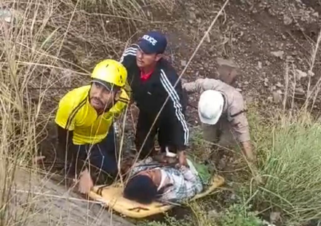स्विफ्ट कार 200 मीटर गहरी खाई में गिरने के बाद चट्टान पर अटक गई थी। कार में दो लोग सवार थे|